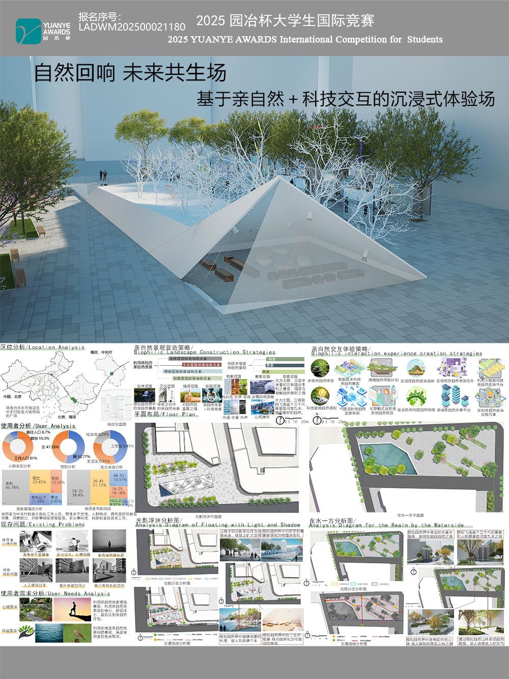 本帖最后由 zyxz 于 2025-7-19 21:05 编辑 本设计在中关村创业街区,利用亲自然元素和科技手段相结合的方式,为使用者打造了一处生态与创新融合具有部分疗愈功能的亲自然交互空间。分别利用“光”与“ ...