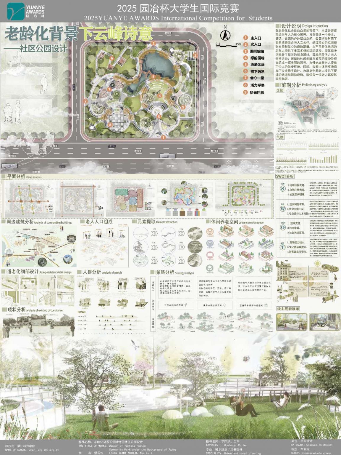 在老龄化社会日益凸显的背景下,本设计紧密围绕老年人为核心展开,旨在营造一个安全,舒适,健康的户外活动空间。公园巧妙利用了自然植物围合与人文关怀,通过精心的空间规划布局和贴心的设施配置,为不同身体状况的 ...