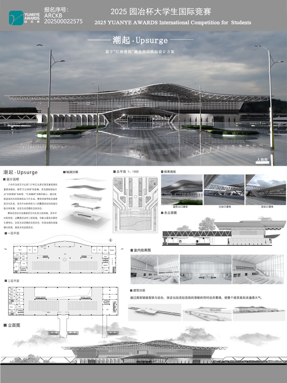 作品名称:潮起潮落 作品简介:六合作为南京市北部门户和江北新区高质量发展的重要承载地,素有"江北明珠"的美誉,其交通枢纽设计以"水脉塑城"为脉络、"江涛叠韵"为概念核心,通过双核波浪形态串联高铁站与汽车站, ...
