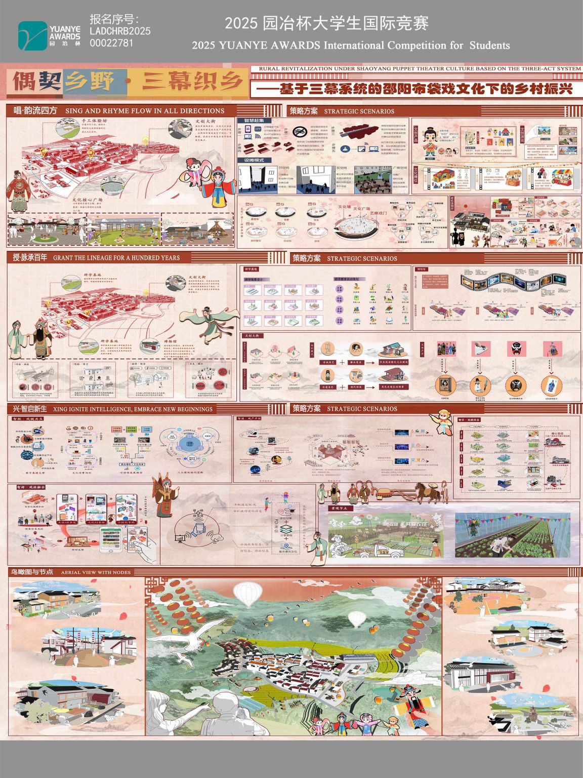 本方案根植邵阳布袋戏“一人一戏班”的独特非遗基因,巧妙融合湘西南乡土风貌与现代设计。以原生竹木构建戏台、麻布为幕,还原其流动本色;青石路径串联非遗工坊、露天剧场与乡土文创空间,使雕刻、唱腔、操演技艺触 ...