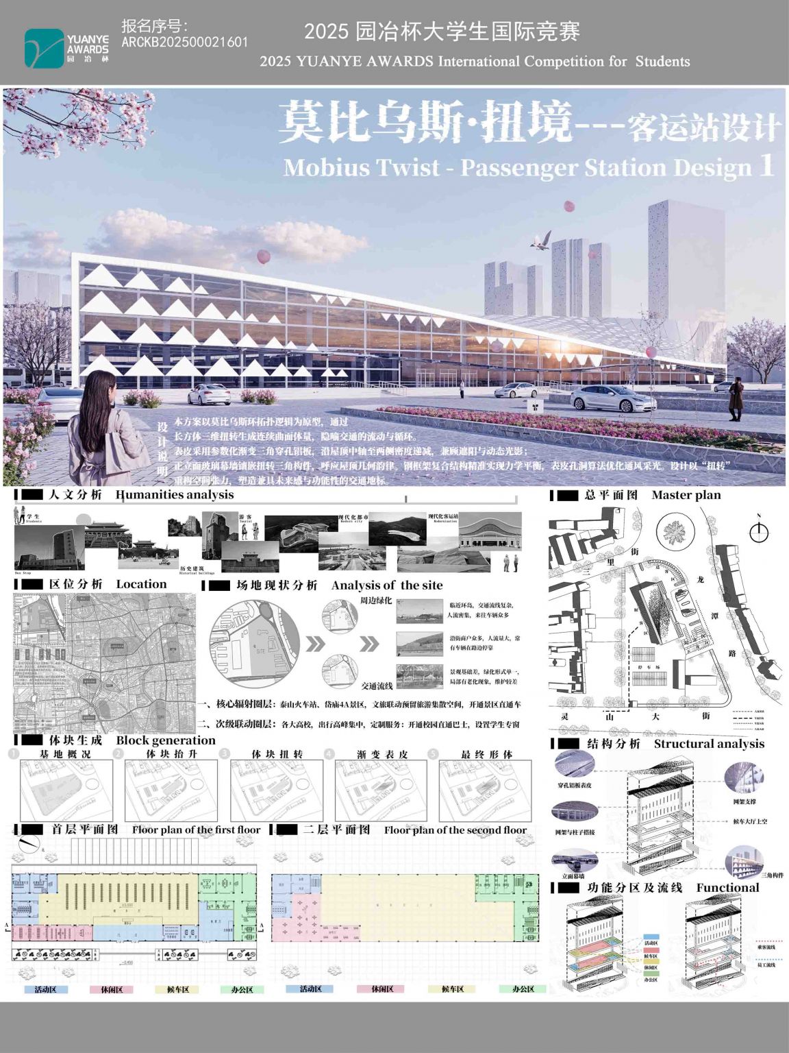 本帖最后由 吕明泽 于 2025-7-23 20:12 编辑 作品简介:本方案是以莫比乌斯环拓扑逻辑为原型,通过长方体三维扭转生成连续曲面体量,隐喻交通的流动与循环。表皮采用参数化渐变三角穿孔铝板,沿屋顶中轴至两侧密 ...