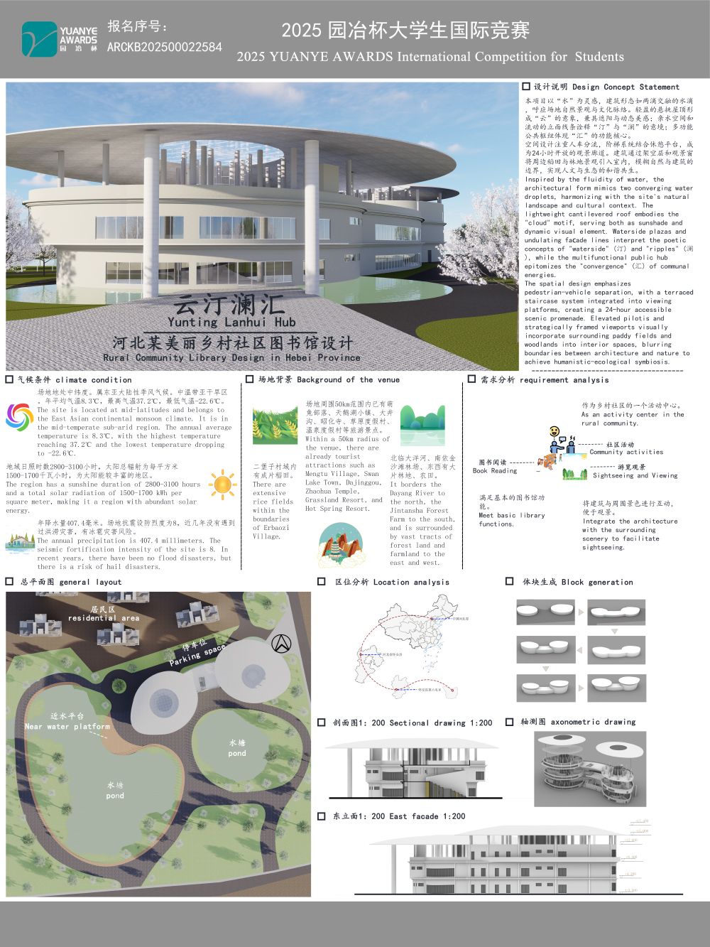 本项目以“水”为灵感,建筑形态如两滴交融的水滴,呼应场地自然景观与文化脉络。轻盈的悬挑屋顶形成“云”的意象,兼具遮阳与动态美感;亲水空间和流动的立面线条诠释“汀”与“澜”的意境;多功能公共枢纽体现“汇 ...