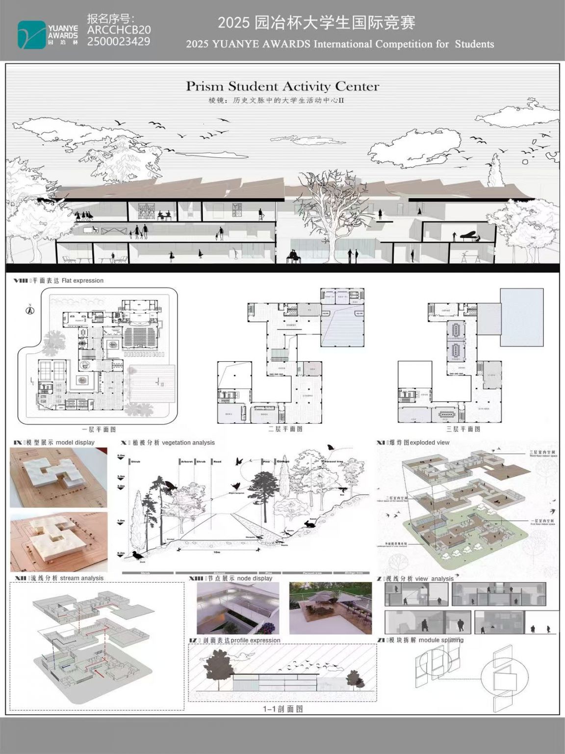 “棱”以建筑的几何线条、空间棱角为依托,塑造富有张力与秩序的物理空间,折线屋顶分割天际线,内部棱角空间界定功能区;“境” 强调精神体验,这里是文艺之境、科创之境、社交之境、本设计旨在希望学生踏入 “棱境 ...