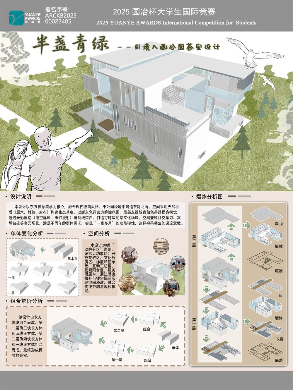 作品简介:本设计以东方禅意美学为核心,融合现代极简风格,于公园秘境中筑造茶隐之所。空间采用天然材质(原木、竹编、麻布)构建生态基底,以暖灰色调营造静谧氛围,局部点缀靛青釉色茶器提亮视觉。通过光影层递( ...