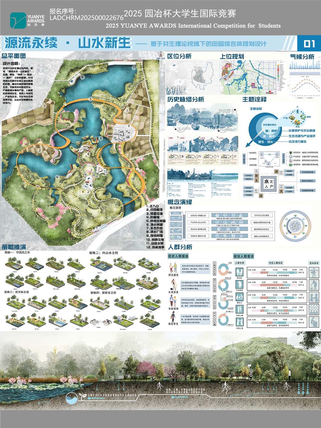 本设计以共生理论为内核,紧扣 “源流永续・山水新生” 主题,呼应 “保护 — 流动 — 循环” 三阶段逻辑。针对场地从农耕共生到工业化断裂的历程,通过水脉织绿网修复生态、文脉活乡村激 ...