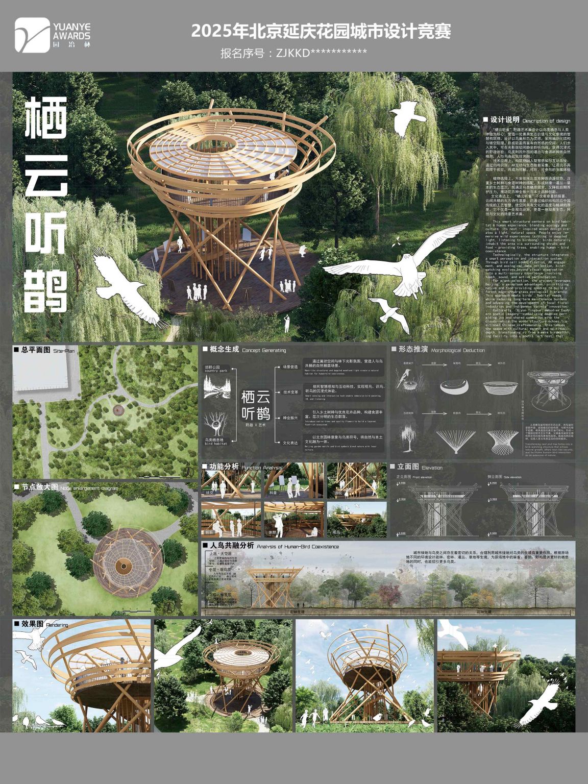 “栖云听雀”野趣艺术巢设计以乌类栖息与人类体验为核心,营造一处兼具生态价值与文化意境的智慧构筑物。设计以鸟巢形态为灵感,采用编织化结构与镂空肌理,形成轻盈而富有自然感的空间。人们步入其中,可在光影斑驳 ...