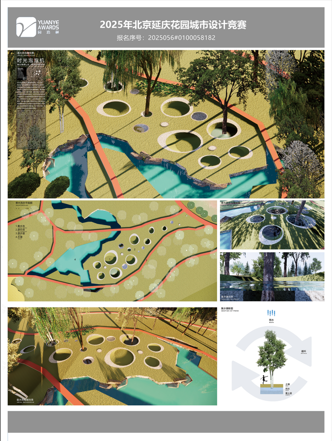 设计灵感来源于儿童玩具泡泡机。设计地块周边多为幼儿校园环抱。日常为城市公园使用并为联系住宅与配套学校的关键节点。泡泡机圆形形态以回应幼儿主题的童趣童稚,圆形更加容易融入主体公园环境中。圆形的集水池保留 ...
